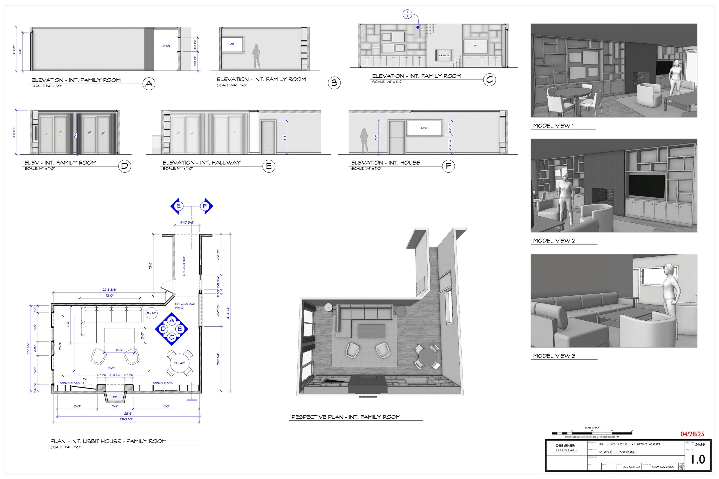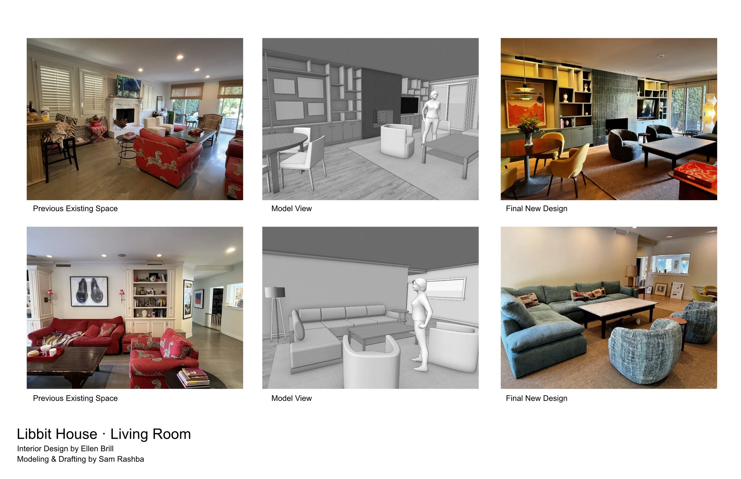 Design process of Libbit House living room. Interior design led by Ellen Brill, and all modeling and drafting done by me in Vectorworks.
